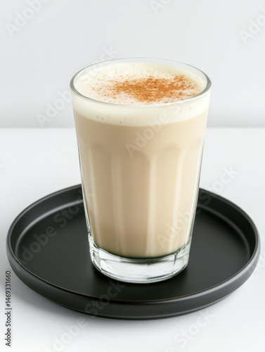 A glass of matcha latte on a matte black plate against a clean white background