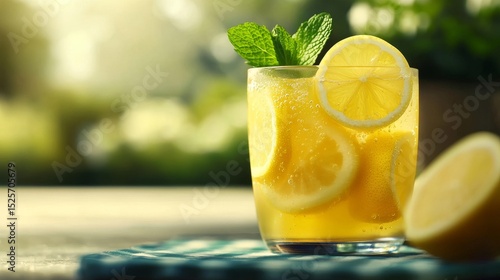 A glass of vibrant yellow lemonade with bright citrus lemon slices and fresh green mint garnish is ready for drinking outdoors.