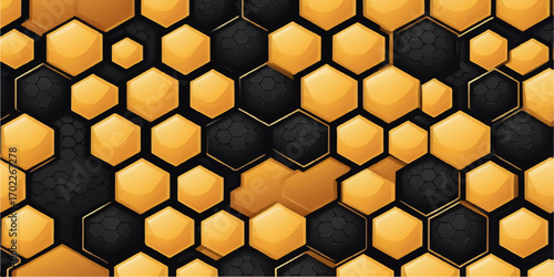 A glossy abstract honeycomb pattern of yellow and orange hexagons creates a seamless, geometric background