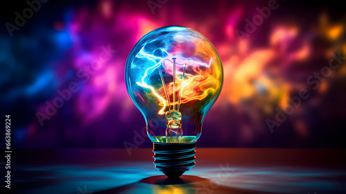 a glowing light bulb in neon color, black background