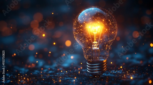 A glowing light bulb on a dark background with sparkling bokeh.