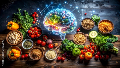A glowing, networked brain is centrally surrounded by colorful, healthy food ingredients.