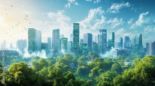 A glowing smart city where air purification systems and green energy dominate the skyline