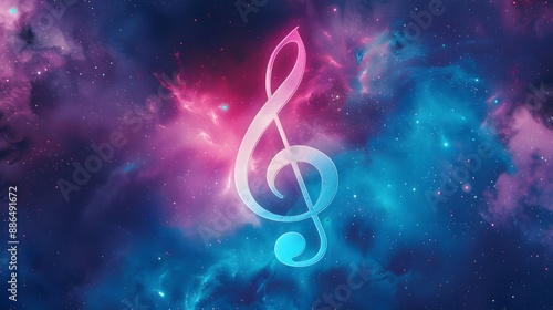 A glowing treble clef set against a cosmic background of pink and blue nebulae.