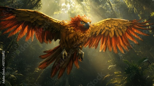 A golden parrot soars through a lush rainforest, its wings spread wide and illuminated by sunlight.