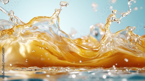 A golden yellow liquid dramatically splashes, capturing fluid shapes and waves on a calm blue backdrop, creating an abstract visual of motion art and dynamism.