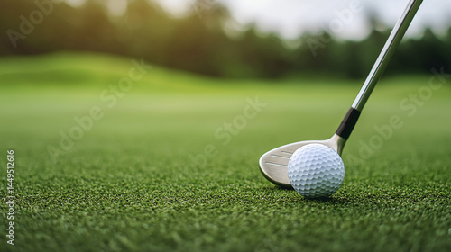 A golf club prepares to strike a golf ball on a neatly trimmed green course under natural daylight.