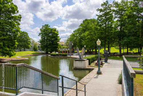 a gorgeous spring landscape at Louis Armstrong Park with lush green trees, plants and grass, a lake, blue sky and clouds in New Orleans Louisiana USA