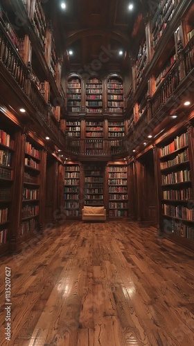 A grand library interior with wooden shelves filled with books.