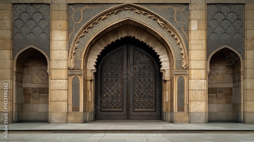 A grand mosque door with intricate geometric patterns carved into dark wood, framed by elegant arches.