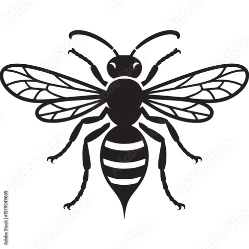A graphic illustration of a bee with striped abdomen and detailed wings in black and white style on transparent background