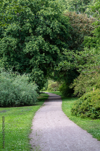 A gravel path is winding its way through a green park called Alnarpsparken in southern Sweden