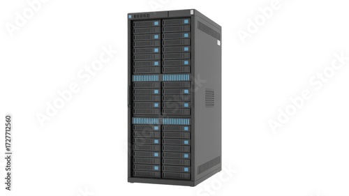 A gray server rack with multiple hard drives shown against a plain white background in a studio shot