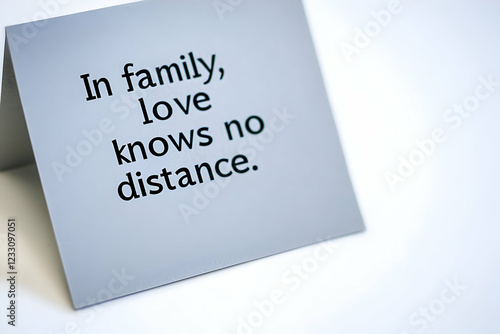 A gray sticky note with the quote "In family, love knows no distance." isolated on the white background