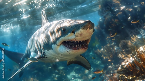 A great white shark glides gracefully among colorful coral reefs and small fish in clear waters
