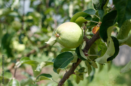 A green apple is hanging from a tree