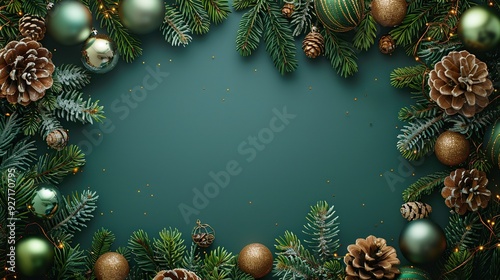 A green Christmas background featuring balls, decorations, and fir branches, with a vintage retro style for a holiday celebration and New Year greeting card template.