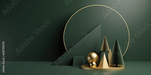A green wall with a gold and black christmas tree. Generative AI. Simple Christmas trees. Copy-space, place for text.