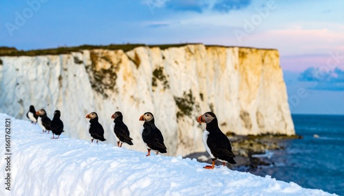 A group of Atlantic puffins standing in a row on a snowy ledge with white cliffs and the ocean in the background.