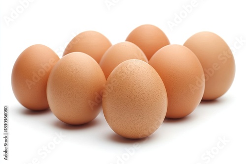 A group of brown eggs arranged in a circular pattern on a white surface.