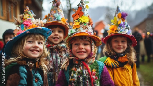 A group of children wearing colorful hats and scarves