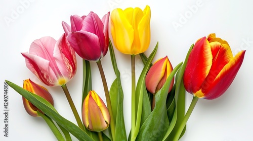 A group of colorful tulips with green stems and leaves, on a white background.