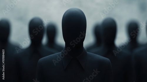 A group of dark, faceless figures stands silently in a misty environment, creating an eerie and mysterious atmosphere.