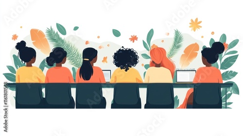 A group of diverse individuals seated at a table, engaged with laptops amidst a vibrant backdrop.