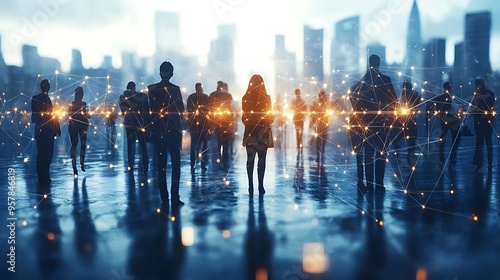 A group of diverse people connected by a web of glowing network nodes, each node pulsating with light, set against a backdrop of a digital world map, soft ambient glow, hd quality.
