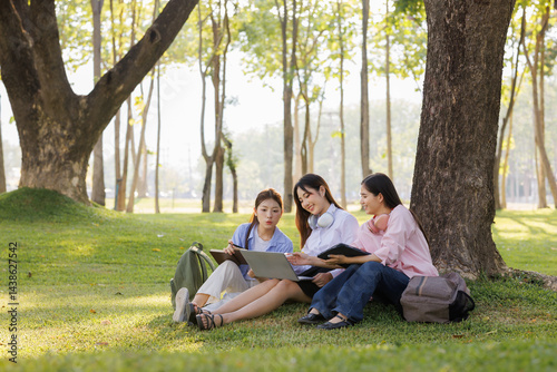 A group of female students sits under a tree in the park, laughing and chatting joyfully together.