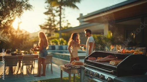 A group of friends having a barbecue in the backyard, showcasing friendship and outdoor leisure.