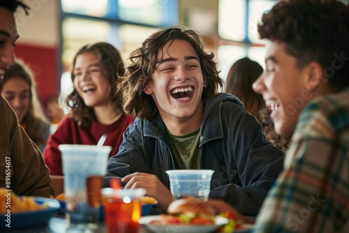 A group of friends sitting together in the cafeteria, laughing and enjoying their lunch.