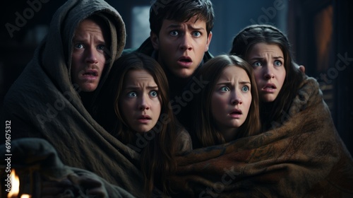 A group of friends telling stories at the campsite in the forest.