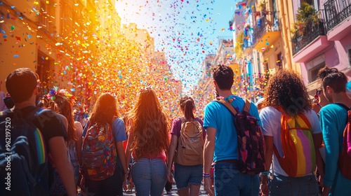 A group of LGBTQ+ friends celebrating together at a Pride Parade, surrounded by colorful and joyful atmosphere