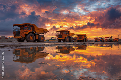 A group of orange dump trucks are parked on a muddy road