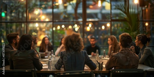 A group of people are gathered around a table in a lively restaurant, enjoying each others company and the vibrant atmosphere