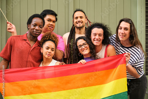 A group of people are holding a rainbow flag and smiling. International Pride Day.