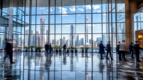 a group of people standing in a lobby with a view of a city skyline through a large window