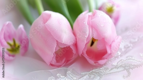 a group of pink tulips sitting on top of a bed of white and pink tulle with water droplets on them.