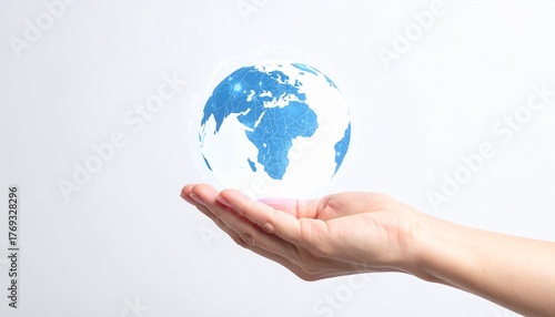 A hand cradling a luminous globe, representing global connectivity and environmental consciousness