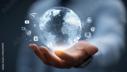 A hand gently cradles a translucent, glowing Earth globe, encircled by digital icons representing global connectivity and technology