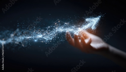 A hand gently guides a glowing, digital arrow upwards, formed by interconnected particles