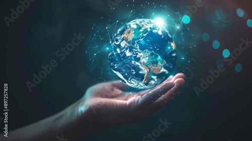 A hand holding a glowing Earth, symbolizing technology, global connection, and futuristic innovation.
