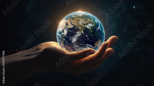 A hand holding the earth in space with stars and a glowing light above the planet illustration