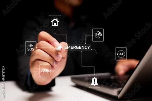 A hand interacts with a digital interface displaying emergency services icons, symbolizing instant access to help through technology.