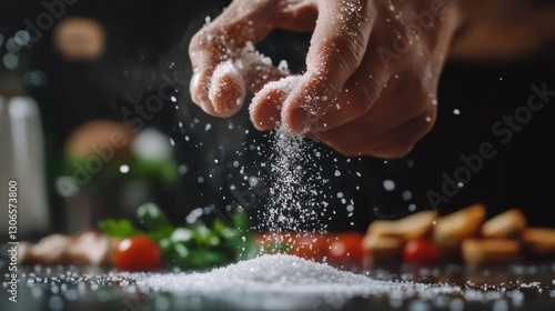 A hand is sprinkling salt over a small pile of seasoning