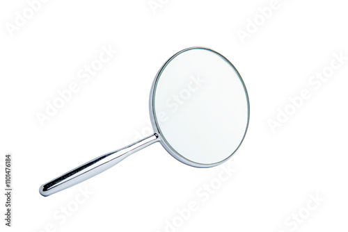 A handheld mirror with a sleek silver handle and a circular reflective surface.