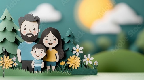 A happy family of three parents and a young child spending time together in a lush picturesque meadow surrounded by a scenic landscape of trees flowers and a bright sunny sky