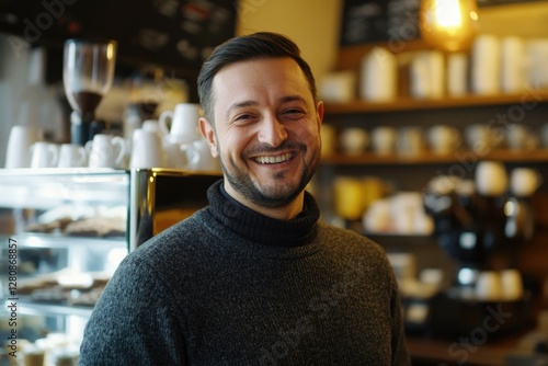 A happy man stands behind a counter with coffee cups and pastries, serving customers.