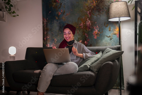 A happy Moroccan Muslim woman wearing a hijab uses her laptop on the sofa at home. She is smiling and enjoying her time online.